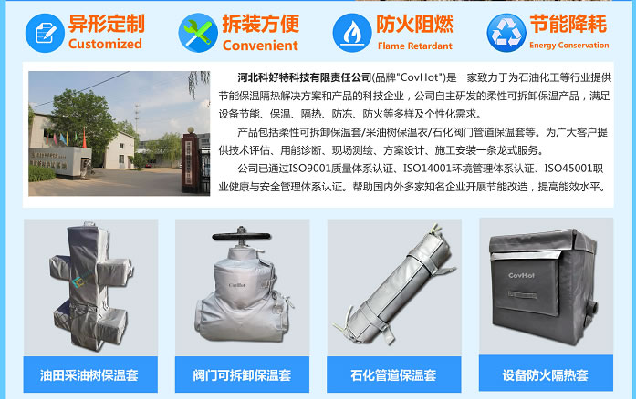 據(jù)了解,科好特公司的品牌"CovHot",是一家致力于為石油化工等行業(yè)提供節(jié)能保溫隔熱解決方案和產(chǎn)品的科技企業(yè),科好特自主研發(fā)銷售的柔性可拆卸保溫產(chǎn)品,滿足設(shè)備節(jié)能、保溫、隔熱、防凍、防火等多樣及個性化需求。