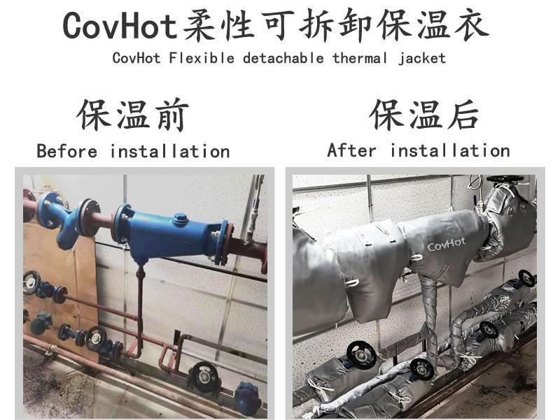 管道閥門保溫選用可拆卸柔性保溫套,保溫效果好,耐高低溫、防水、防油、具有良好的憎水性能,能夠在各種復(fù)雜工況下使用。就傳統(tǒng)鐵皮保溫而言,可拆卸柔性保溫套適用于不同形狀的管道、設(shè)備,特別是對(duì)非標(biāo)設(shè)備更有優(yōu)勢(shì),甚至傳統(tǒng)保溫在無法做到的情況,可拆卸柔性保溫套也可以做到。不僅如此,可拆卸柔性保溫套,適合用于有頻繁檢修需求的設(shè)備使用,拆裝便捷,隨檢隨拆,有效提高檢修效率,并且,還能夠多次反復(fù)使用。