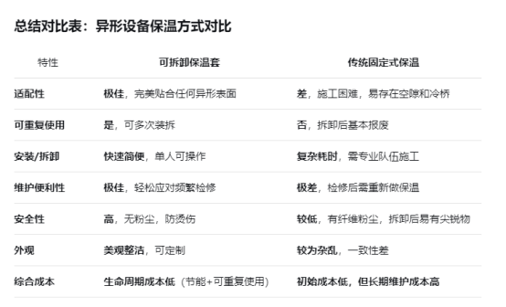 對于形狀不規(guī)則、需要頻繁維護(hù)或檢修的異形設(shè)備,使用可拆卸保溫套不是一種簡單的替代選擇,而是一種在保溫效率、維護(hù)便捷性、安全環(huán)保和長期經(jīng)濟(jì)效益上都具有壓倒性優(yōu)勢的現(xiàn)代化解決方案。它特別適用于石油化工、制藥、食品飲料、電力、新能源等對工藝溫度控制和設(shè)備維護(hù)要求高的行業(yè)。