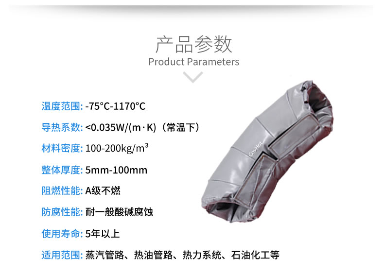 蒸汽管道保溫衣可根據(jù)不同形狀的設備量身定制各種保溫層,適用于飲料,食品,石油化工,冶金,造紙,電力等行業(yè),其材料為特殊材料,隔熱性能良好,使用壽命長,不易老化,大大提高了利用率和降低維修維護成本。韌性好,易于彎曲聯(lián)接??梢源蟠蟾纳乒ぷ鳝h(huán)境,降低工作環(huán)境溫度,重要的是防止工作人員出現(xiàn)意外。