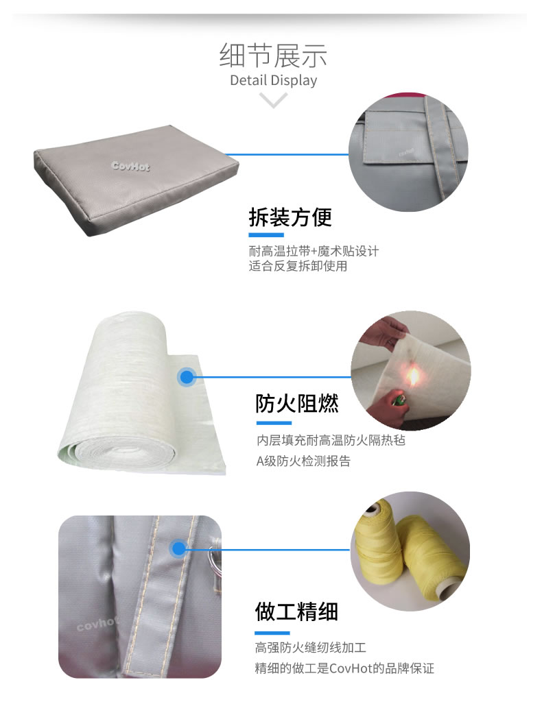 可拆式保溫套保溫效果好,拆裝方便,易于日常維護保養(yǎng),能反復使用,對環(huán)境無污染,與人體接觸后不刺激皮膚。根據(jù)現(xiàn)場的物料產(chǎn)生火災的可能性、火災的預期溫度、救火需要的時間等綜合考慮,設計適應不同的溫度、耐火時間,從而達到經(jīng)濟、合適的防火效果。