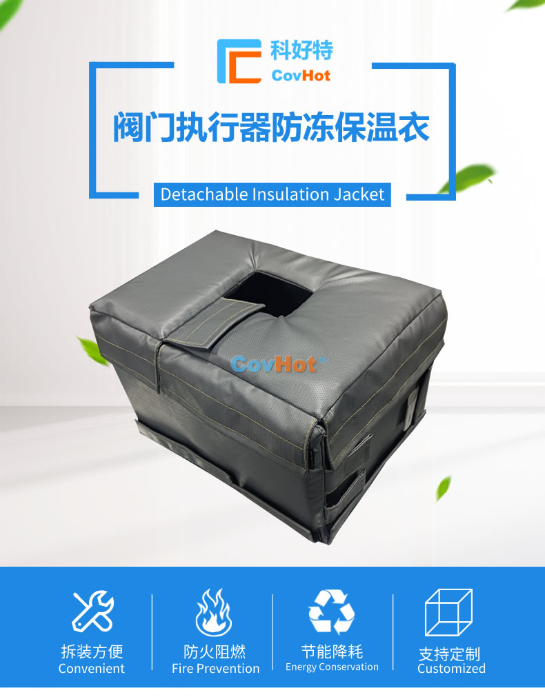 執(zhí)行器防凍保溫套由內(nèi)隔熱包裹層、中間隔熱保溫層、外隔熱防護(hù)層以及電伴熱系統(tǒng)組成,根據(jù)各種型號的執(zhí)行器工作環(huán)境、外形尺寸等量身定制而成。