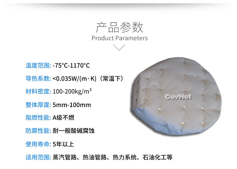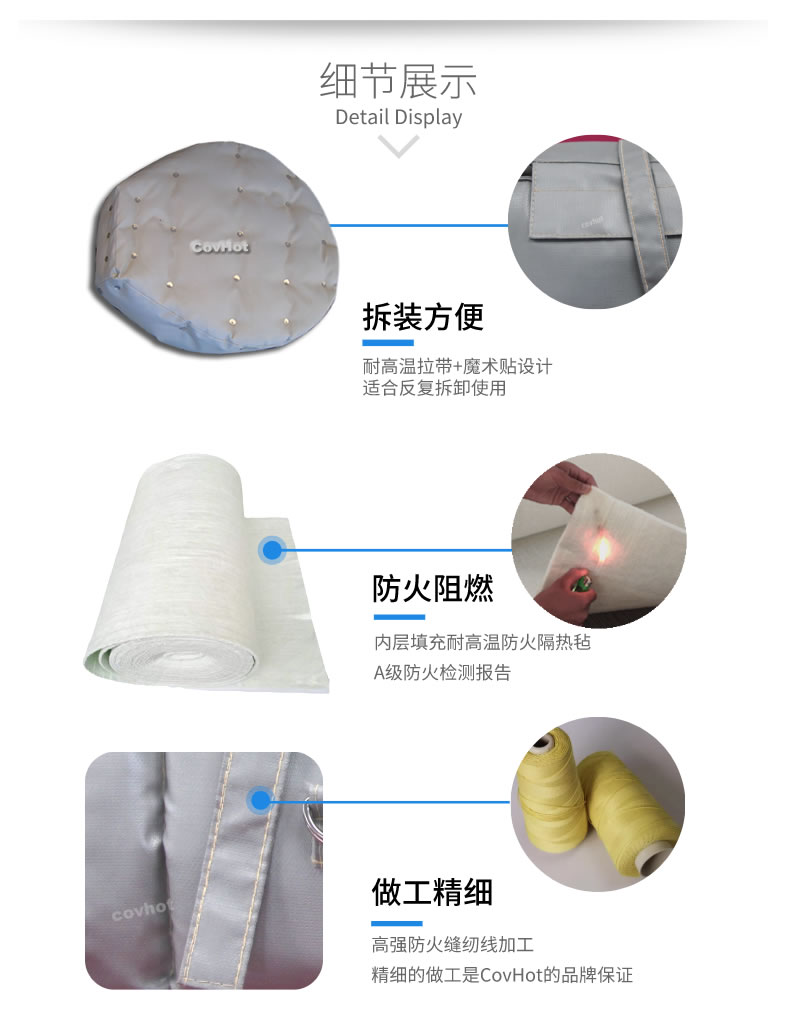 柔性可拆卸人孔保溫隔熱套可以很好的解決以上問題,產(chǎn)品耐高溫可達(dá)550℃,保溫隔熱效果好,可以很方便的進(jìn)行人孔設(shè)備拆裝,方便清洗和維護(hù),表面采用可擦洗材料,防水防油,耐腐蝕??梢苑磸?fù)拆裝使用。是工業(yè)進(jìn)行人孔保溫的理想產(chǎn)品。