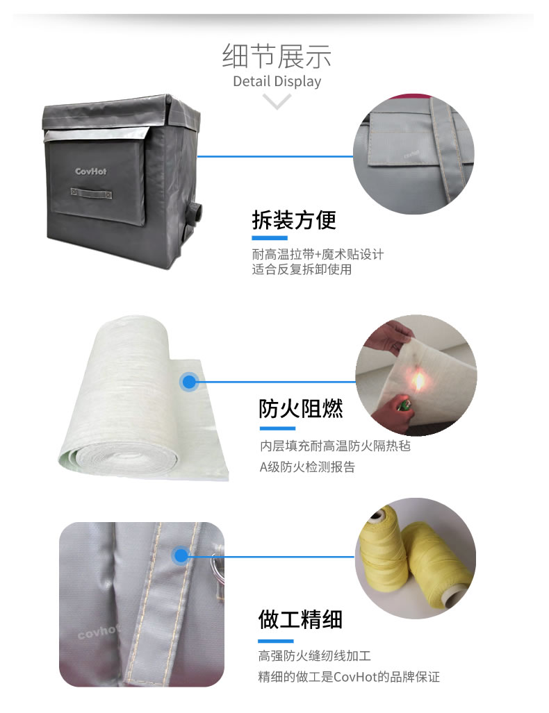 柔性防火罩特為所需保護(hù)的零件、執(zhí)行器、閥門(mén)、儲(chǔ)槽和管道的形狀而專門(mén)設(shè)計(jì)和量身定做。可為控制器、閥桿、鋼框架和按鈕建立凹進(jìn)處和孔洞;防火罩為特殊定制,可根據(jù)客戶需求在所需位置開(kāi)設(shè)穿過(guò)電源線的通孔,且在安裝前可隨時(shí)進(jìn)行修改。防火罩外觀可采用不同顏色織物制作,以便在系統(tǒng)不同區(qū)域內(nèi)區(qū)分自動(dòng)操作和方便操作人員在緊急狀況下操作。